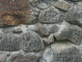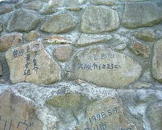 | 下川町にある万里の長城は2000年に向けて公園を取り巻くように万里の長城のミニチュア版が作られ、 その築城の石に記念の文字を書くことが出来た。(書けたのは2000年の10月までです。) 書いた文字は、後で消えないように彫り込まれて、墨が入れられる。 98年7月22日。僕らは家族でココを訪れて、思い思いの文字を書いていった。 5年前に訪れて、書いた石を見つけるのが目的だった 家族でもう来ることはないだろう。いつか子供たちが大きくなったときに思い出して訪れてくれればいい・・・当時そう思った。 そこへ5年ぶりに来てみたのだった。数ある石の中から当時の記憶を辿りながら、僕らはそれを見つけた。次に来るのはいつだろうか? ついでになったが、僕らが5年前に来た後にT氏が訪れて、僕らの書いた石に墨入れしたばかりのものを写真に撮ってきてくれた。 今度はそのお返しに、僕らがT氏の書いた石を見つけてきた。 |