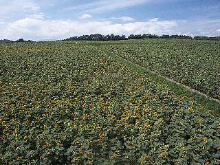 | その日は快晴だった。だが、同時に北海道を離れる日でもあった。 朝から、朝食に飽食気味に鮭の切り身を処分して僕らはパリパリに乾いたテントを片付けて、キャンプ場を後にした。 リアシートには生ごみ、空き缶の袋が鎮座していた。 夜に苫小牧東までたどり着けばいいので、まるまる空いた1日をどう使おうか? 僕らは、南下して北竜の”ひまわりの里”へ寄ることにした。140Km2時間ちょいの距離にあるが いくら、高速で走れると言っても、”高速道路”として舗装されていない公道での走りには緊張が付き物で、信号もあれば、牛の横断もある。 おまけにネズミ捕りにも気を使わなければならない。 もう見慣れた風景が続き、高速公道にはうんざりしながらも、昼前に到着した僕らは、自転車を借りてひまわり畑の中を散策に乗り出した・・・ が、ご存知のように ひまわり は、なぜか一方向を向いているため、畑に入って反対側に回るとひまわりの背中しかみえないのだ(笑)。 結局、畑の入り口からの眺めが一番いいことに気づき、出発点に戻っていった。 ”ひまわりの里”の名にふさわしく、ここを出る時には、太陽はひまわりの方を向いて南中をむかえたので、 道の駅”サンフラワー北竜”まで戻り、駐車場の端に車を止め、芝生にオーニングを張り出してゆったりとランチタイムを過ごした。 当然プシュもね(笑) |