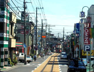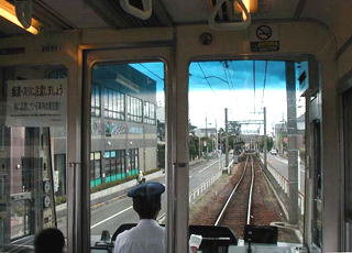 江ノ島駅を出てから腰越駅の前までは路面電車になっています。江ノ電の後ろを車がついてきます。 | |