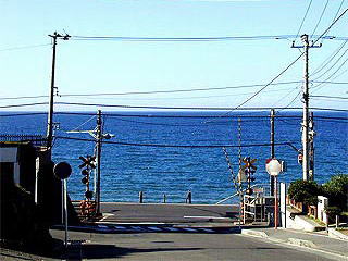 SDファンの皆さんにはおなじみ、鎌倉高校前駅脇の踏切です。 陵南との練習試合のあとのシーン、流川が仙道に「よう…勝負しろい」と言ったシーン、ゴリ・木暮1年時の回想シーン(#117 14巻14ページ・『大健闘じゃん』のシーン)がこの場所です。ちなみに『大健闘じゃん』のシーンで描かれている車両は1000形です。 |