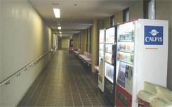 | さて、自販機といえば、9巻59ページで仙道がアクエリアスを飲んでいるシーンの自販機はどこだ? と、体育館中ぐるっと探しました。写真の自販機2は、2階の南側(だったかな…)スタンドの出口をでてすぐのところにあります。同じコーラの自販機ですし、仙道が牧帝王に声をかけられた後、わっと歓声が聞こえているので、おそらく競技場に近いところだろうという予想とも合っていて、「自販機が1台じゃなくて4台もあるけどきっとここに違いない」、と思ったのですが、よく見るとコミックスでは、ここも床がタイルになっています。先ほどの自販機1のところと同じ床です。自販機2のところの床はこのような細かいタイルではありません。そうすると、自販機1と同じ廊下の反対側にある、自販機3という可能性も出てきました。(この写真の奥にかすかに自販機1のBOSSの青い色が見えます) でもこちらも、自販機は1台ではなく3台あります。 結局、今のところ、仙道がアクエリアスを飲んでいる自販機は、このどちらかではないかと思うのですが、これだ!と確信する決定打はいまひとつありません。つまりは、謎です。 |