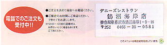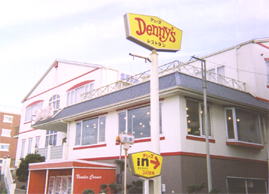 これが上の写真矢印のデニーズ鵠沼(くげぬま)海岸店。 海岸をひた走った後、ここで姉妹でエネルギー補給しました。 ありがたや24時間営業。 |