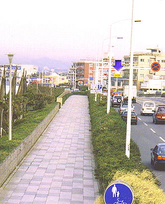 この写真は70mmのレンズで撮影しましたが、100mm程度の望遠レンズで歩道橋の上から撮影するのが一番原作のアングルに近い写真が撮れるのではないかと思います。歩道橋の下から撮った写真。花道の目から見た風景はたぶんこんな感じでしょう。