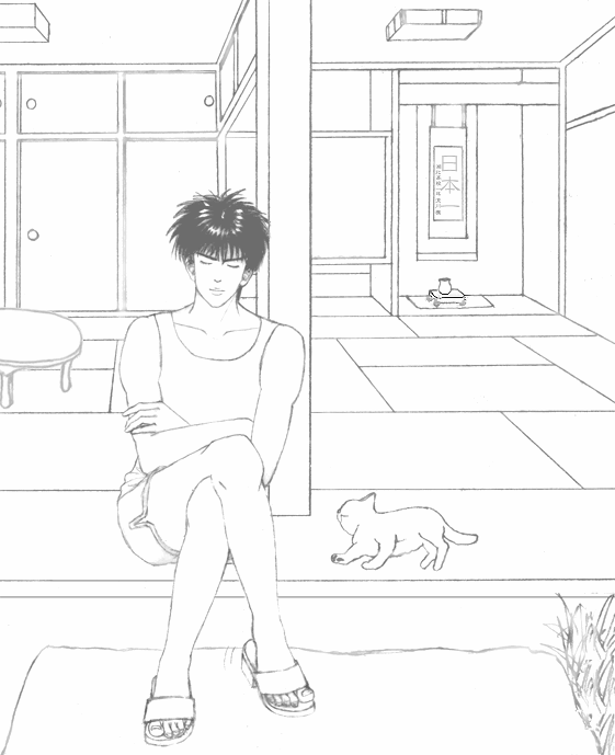 この場所は「おばあちゃんの家」で、お盆に一日だけ里帰り、というつもりで描いています。 掛け軸は、お正月の書き初めで書いたものをおばあちゃんが孫かわいさのあまり掛け軸にしてしまいました。 ……、ということは、この流川はもう高2ということですね…。
