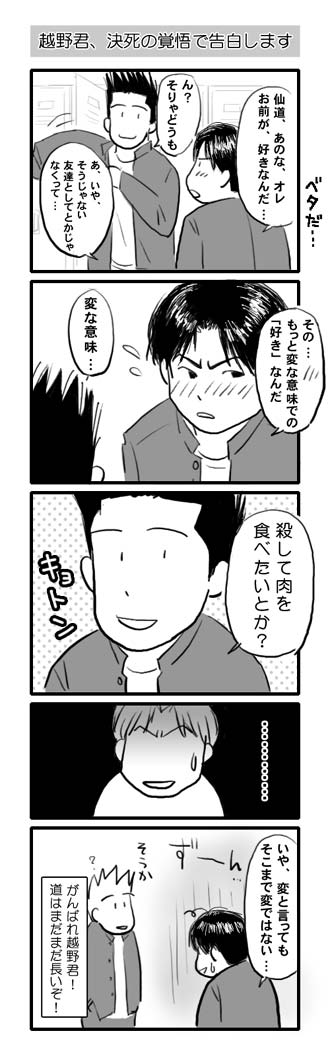 4コマとか言いつつ 5コマ使ってるしさッ!(笑) 天然な仙道と、それに振り回される 一途な一般人越野君、って構図には たいへん惹かれます。 仙道が変なヤツですみません・・ でも好きなんだぜ。へへッ。