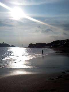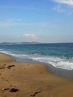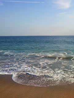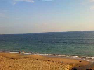 空が青いので、海も青い。水遊びの親子連れや犬の散歩のおじさんや、
