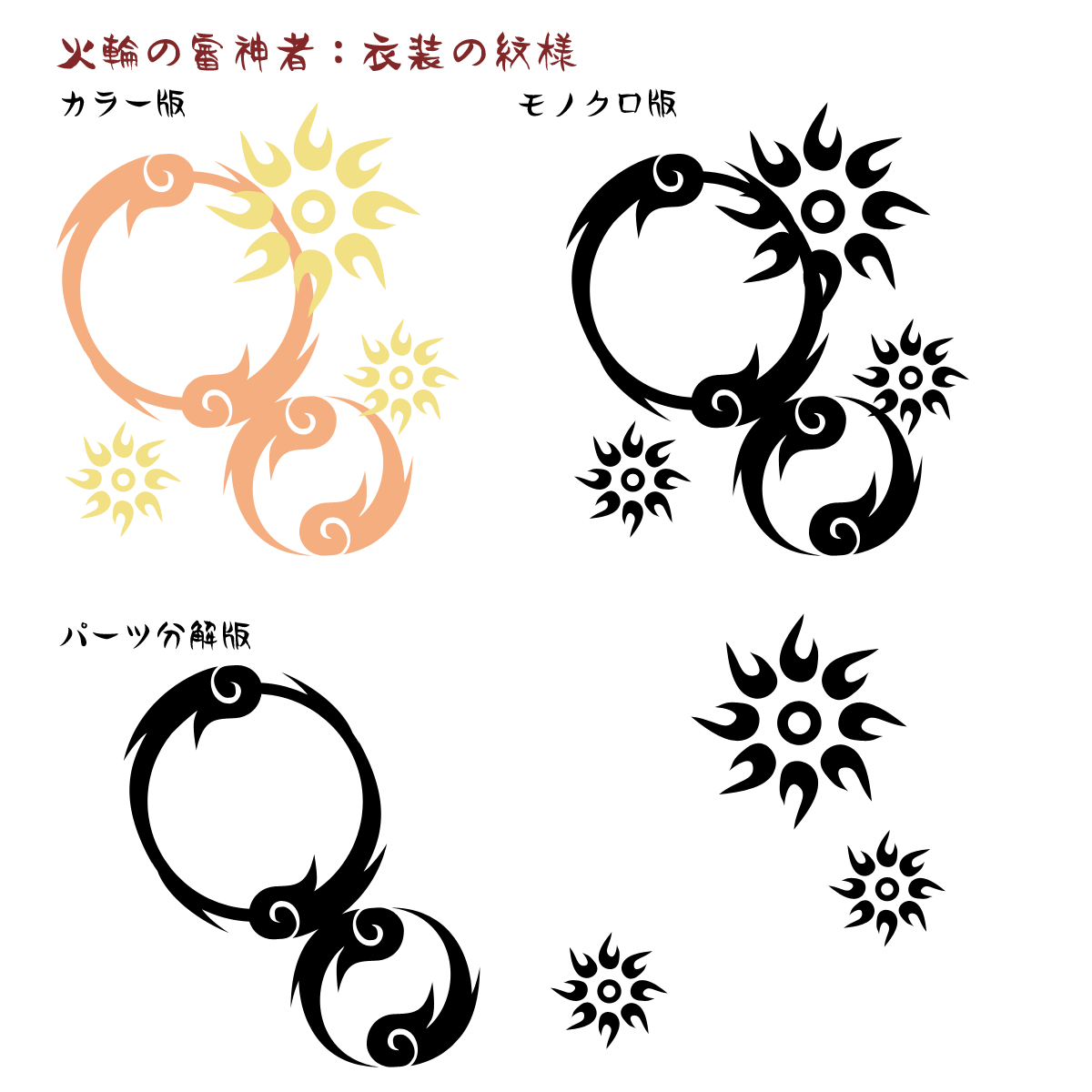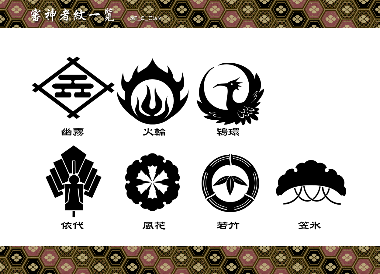 (幽霧:井桁+霞 火輪:太陽+炎 鴇環:鴇 依代:御幣+形代