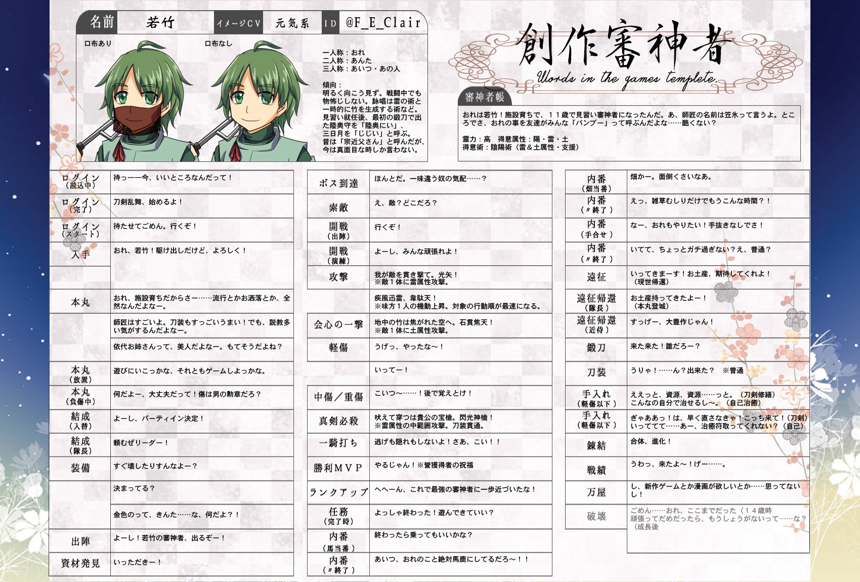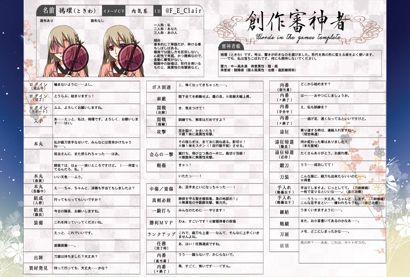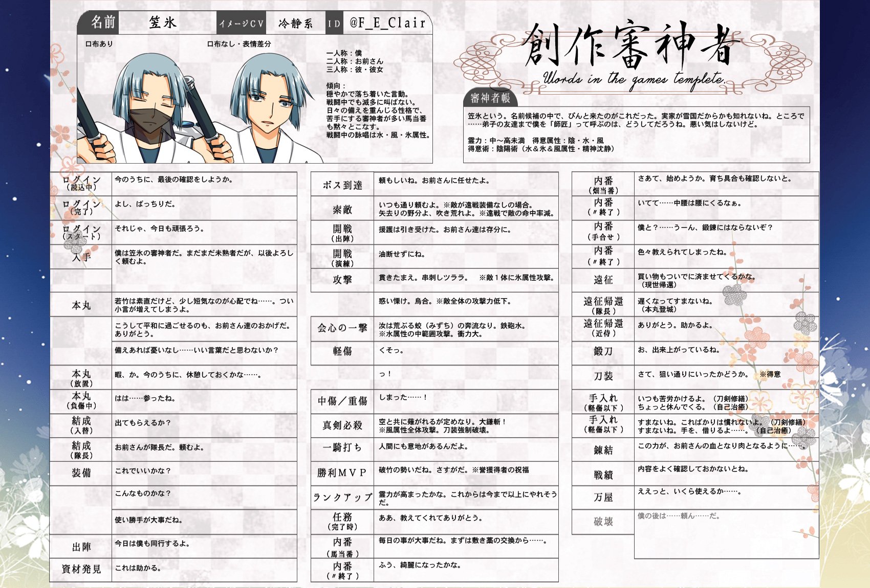 | 審神者テンプレ:別窓 台詞テンプレ:別窓 衣装の紋様:別窓 | |||