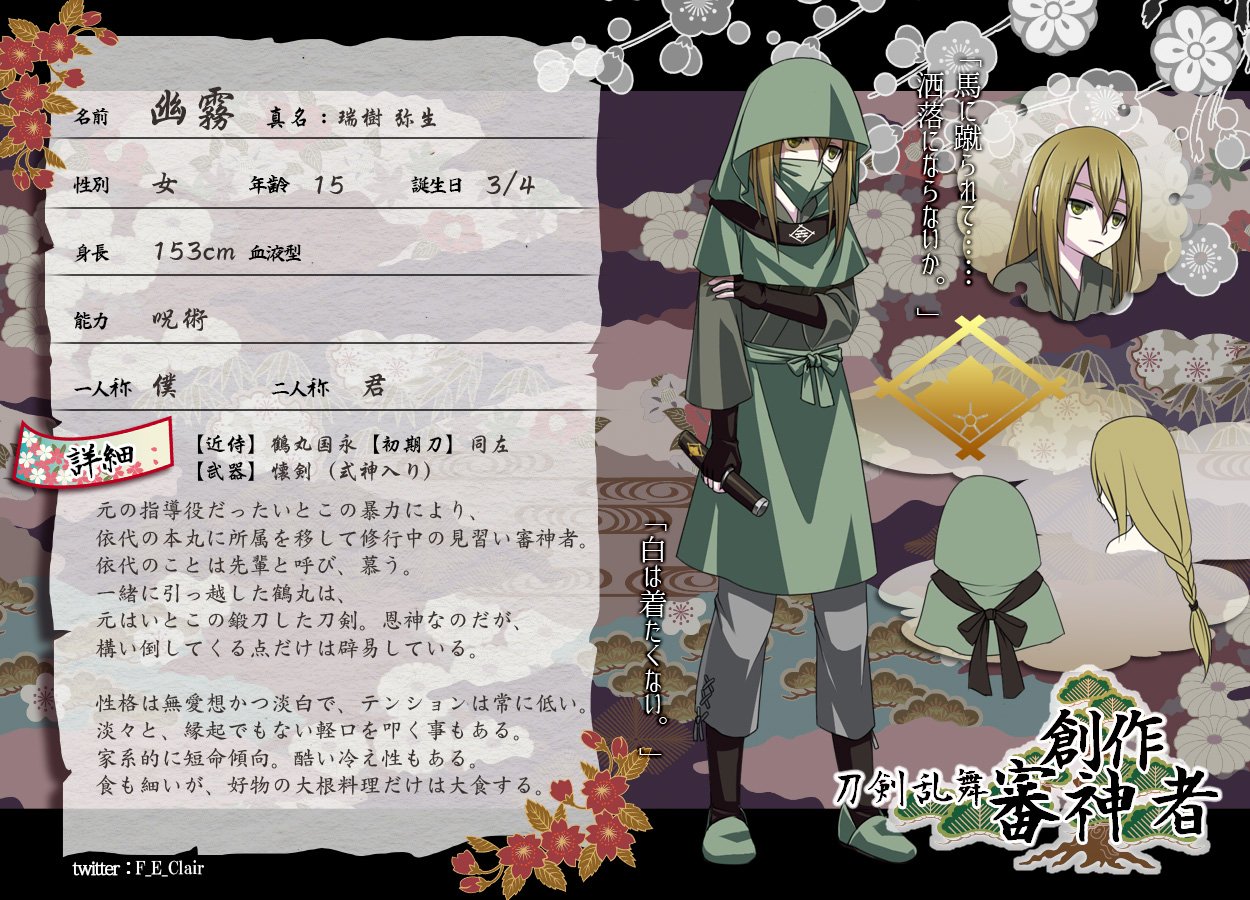 | 誕生日:3月4日(15歳) 初期刀/近侍:鶴丸国永/同左 髪&目の色:枯草色・鶯色 身長:153cm 装備:式神入りの懐剣 霊力:高め(陰) 術:呪術(敵弱体化他) 一人称:僕 二人称:君 趣味:ネットサーフィン(ほぼROM) 元の指導役だったいとこの暴力により、 依代の本丸に所属を移して修行中の見習い審神者。依代のことは先輩と呼び、慕う。 一緒に引っ越した鶴丸は、元はいとこの鍛刀した刀剣。 恩神なのだが、構い倒してくる点だけは辟易している。 性格は無愛想かつ淡白で、テンションは常に低い。淡々と、縁起でもない軽口を叩く事もある。 家系的に短命傾向。酷い冷え性もある。食も細いが、好物の大根料理だけは大食する。 |