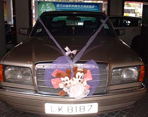 通りかかったホテルの駐車場で見つけた新婚サンの車! こういうのは映画とか以外で本物、初めて見ました。 かなり感激!