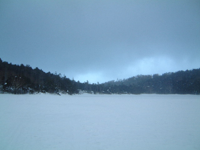 白駒池まで行ってテントしましょ」それで白駒へと向かった。白駒池に15時に到着。そこは広い雪原。夏場が池であることが嘘のよう。