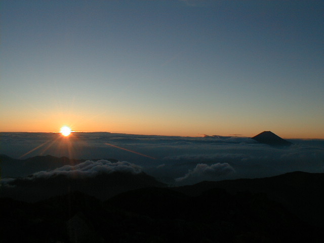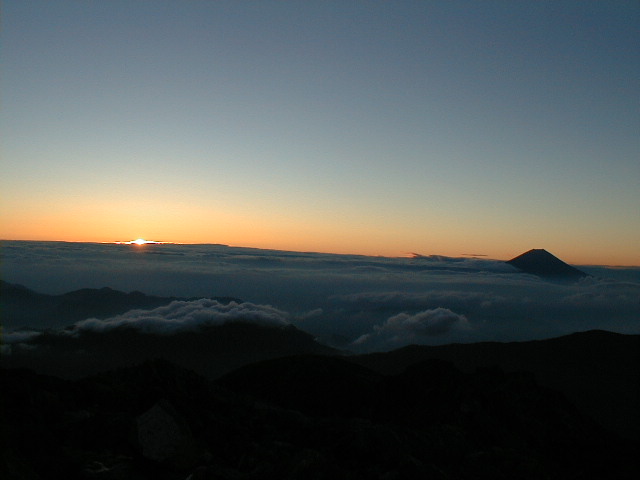 間に合った。山頂の周囲は雲海で雲海のかなたに富士が、そのやや左手の雲海の表層にオレンジ色の縁取りが左右に少しずつ広がっていた。