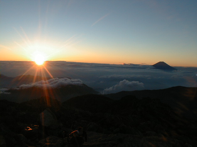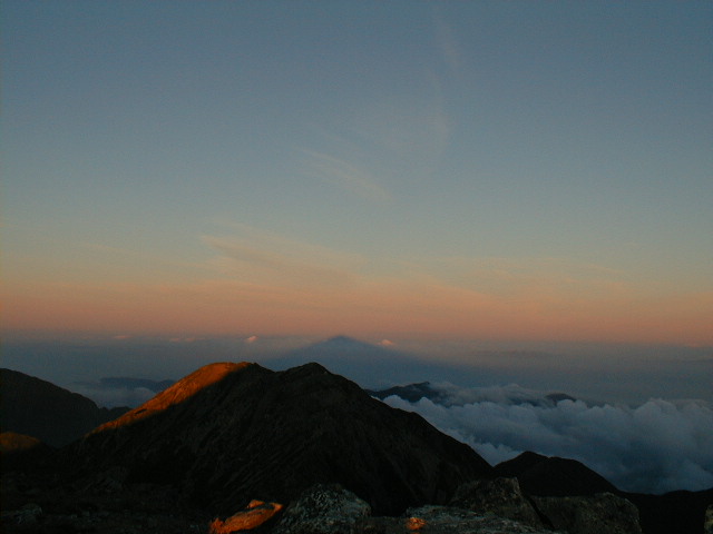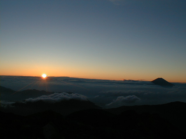 しばらくしてそこから1点の光が、御来光の瞬間でった、時刻は5時8分。みるみる光は大きくなり雲海と赤石を染め、反対側には悪沢の巨大な影が雲海に横たわっていた。