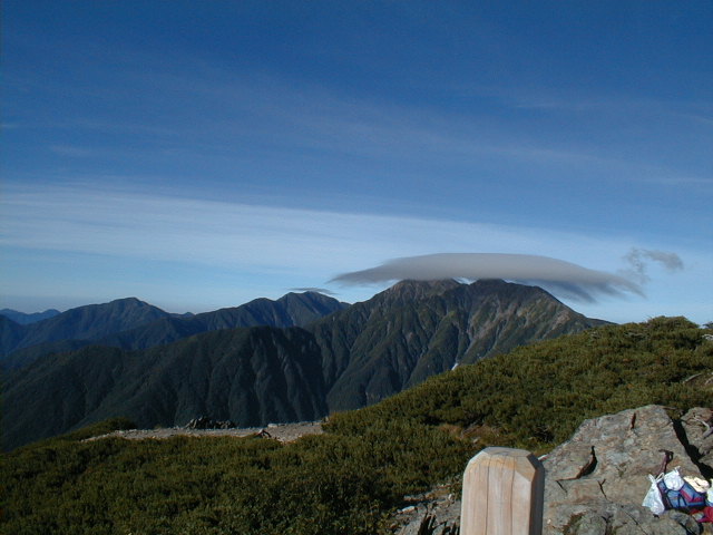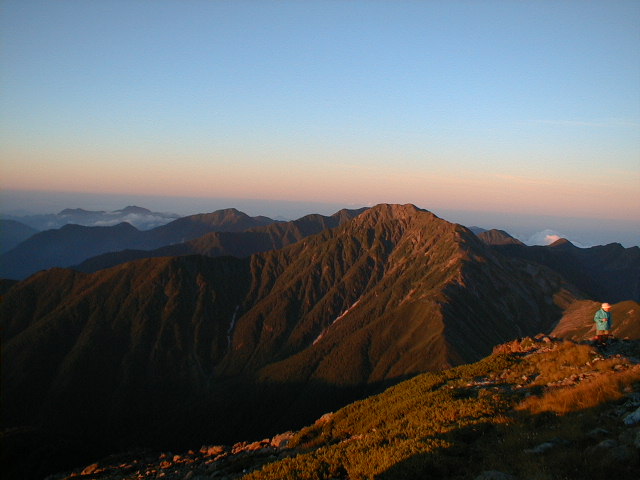出で立ちであった。バース髭に寝る場所と食事時間聞き、とりあえずザックを寝場所に置いて確保。ふたたび小屋のそとに出ると赤石岳のアーベン