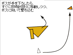 よけ終わったらすぐにボスのすぐ右横まで移動して、張り付いて撃ち込む。開幕時と同様の米粒弾ばらまきがあるが、その位置だとしばらくは弾がこないので、この間に撃ち込んで破壊する。