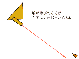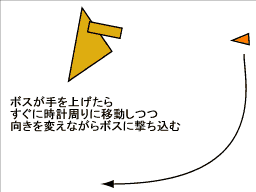 続いてボスが腕を伸ばしてくるが、画面右下にいれば当たらない。腕が戻っていったらすかさず上へ移動(ボスと同じ高さまで)。