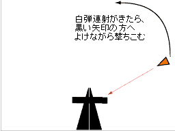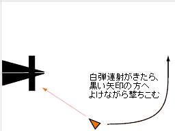 中ボスが右にきたら、しばらくはその場で白弾連射→左側にレーザー発射の繰り返しになる。ここでは図の矢印の範囲で白弾をよけながら撃ちこむ。レーザーが怖いので中ボス左側には出ないように。この攻撃の間には破壊できるだろう。